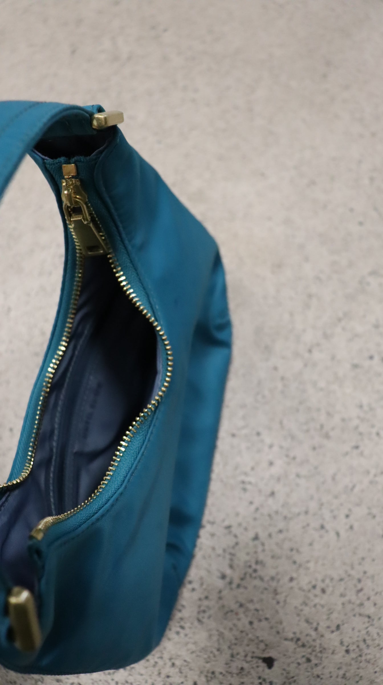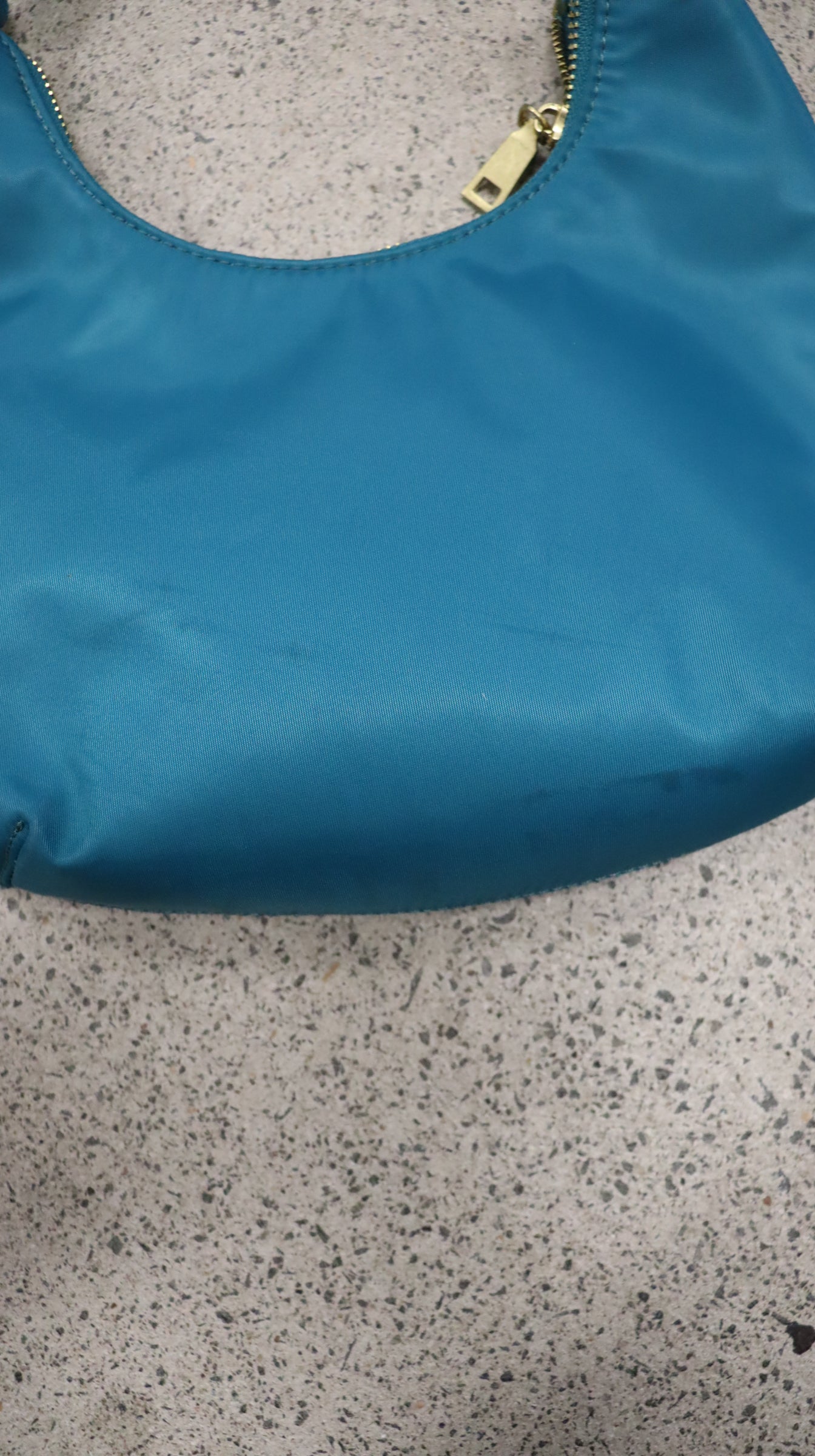 Small shoulder bag, teal, zip opening, half moon shape, internal pocket, has some marks
