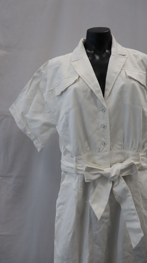 Short sleeve, v neck with three buttons to waist and then a hook clasp and zipper, waist tie, side pockets, centre hemline split on the front