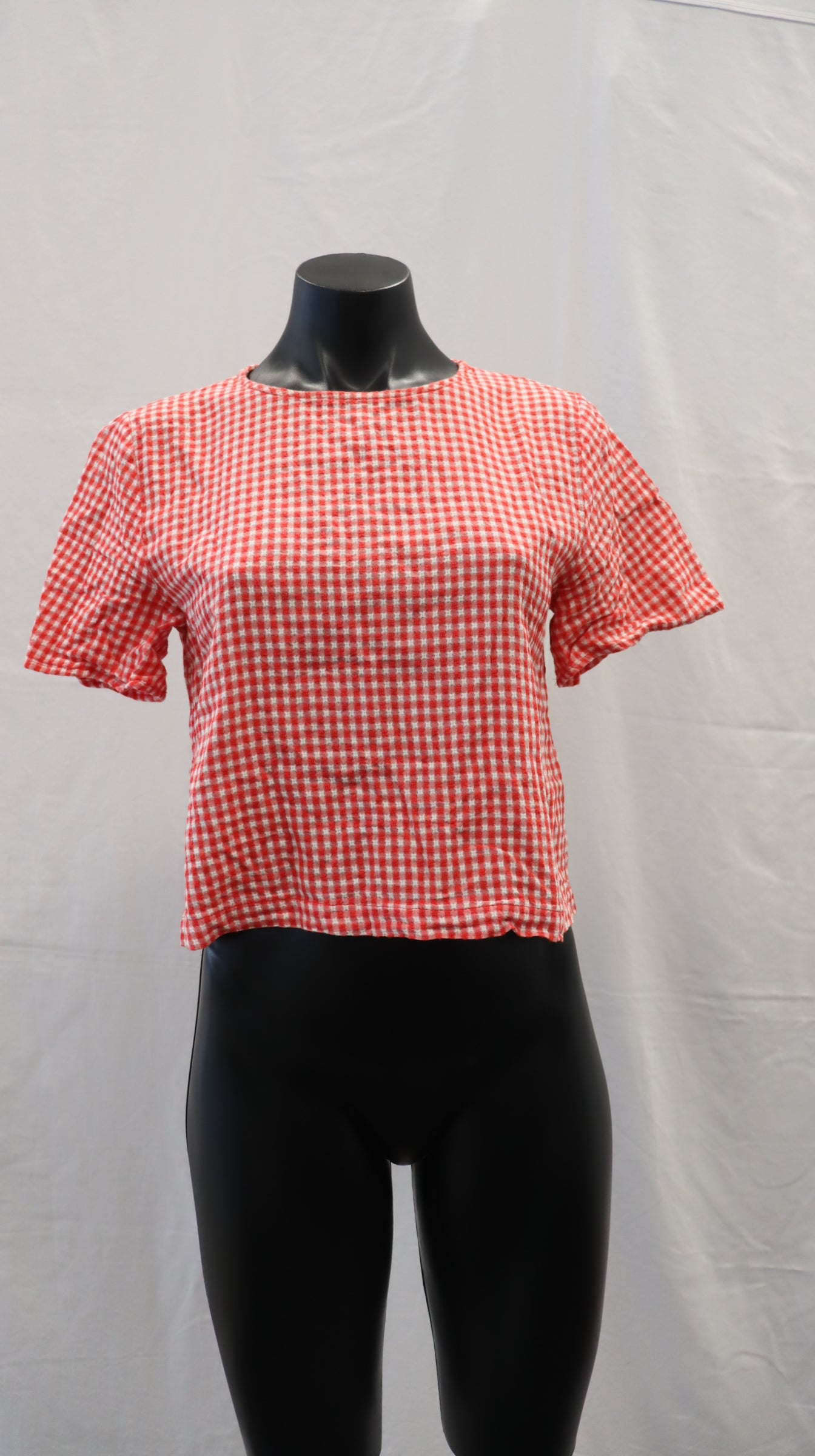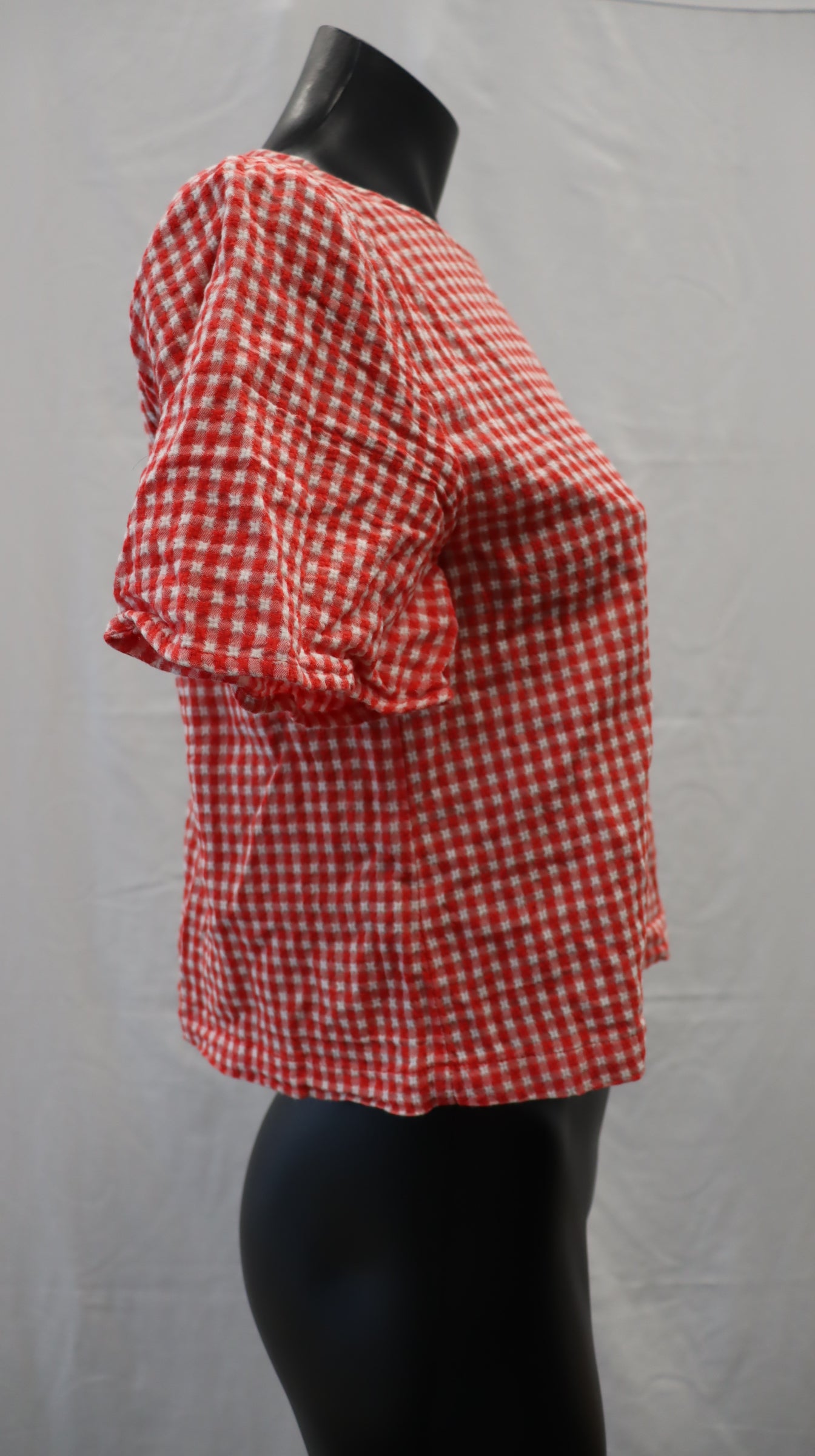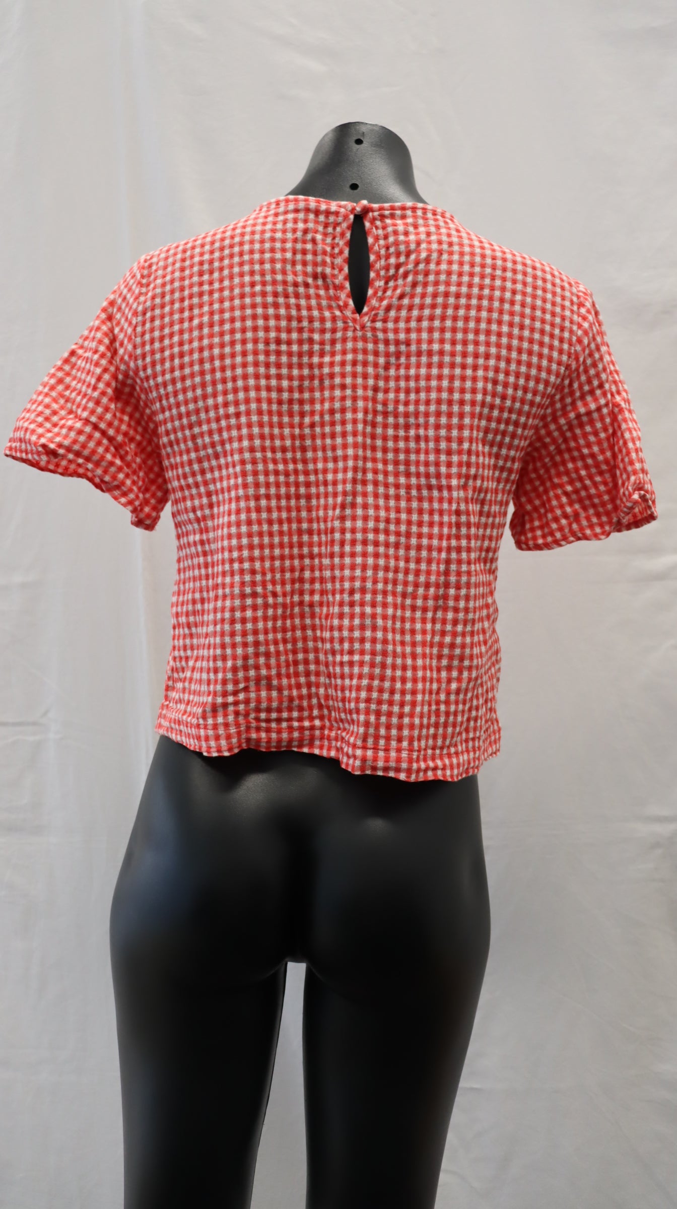 Red and white gingham, button closure on the back of neck with keyhole cutout, cotton