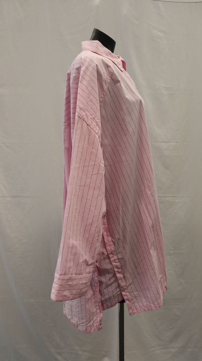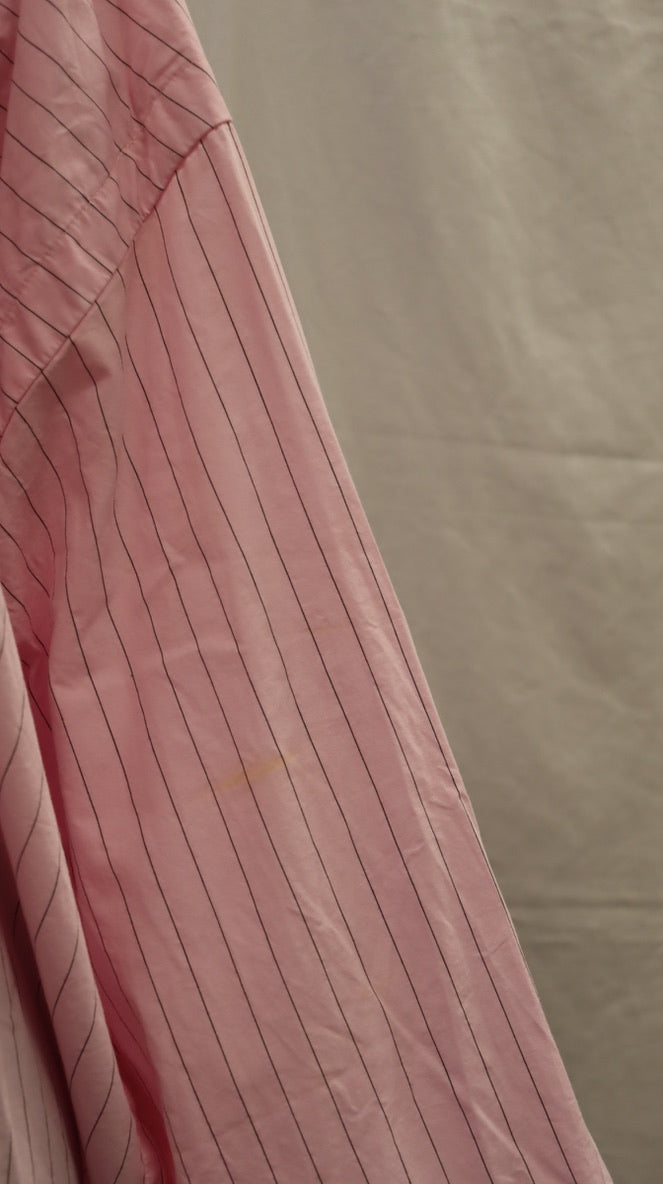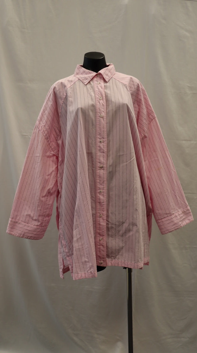 Very oversized, light pink with a fine black stripe, buttons down the front, side split detail with fabric lining, drop shoulder long sleeve, wide sleeve with button closure cuff, has a mark on the left sleeve