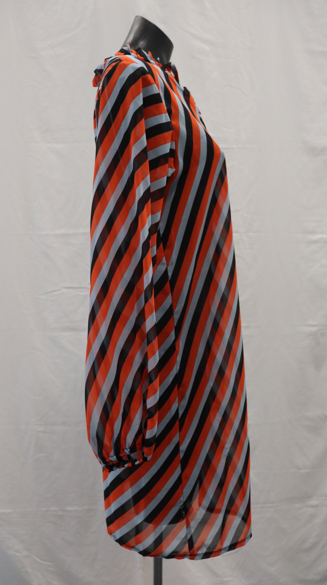 Orange dusk blue and black stripe, long sleeve with elastic cuff, frill neck with drawstring adjustable tie and v cut