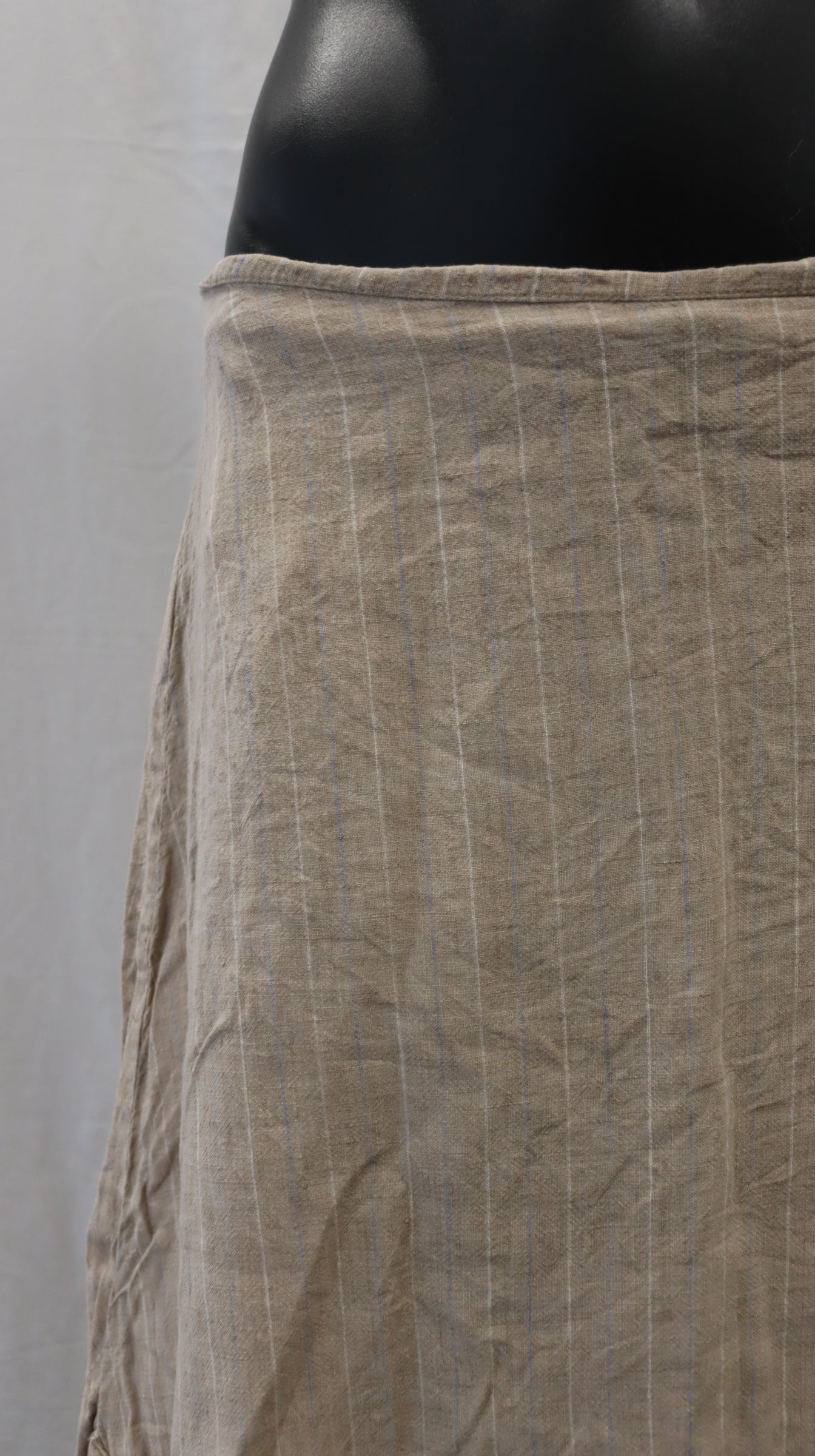 Zip opening on the side, light blue and white stripe, flares out, side splits, linen