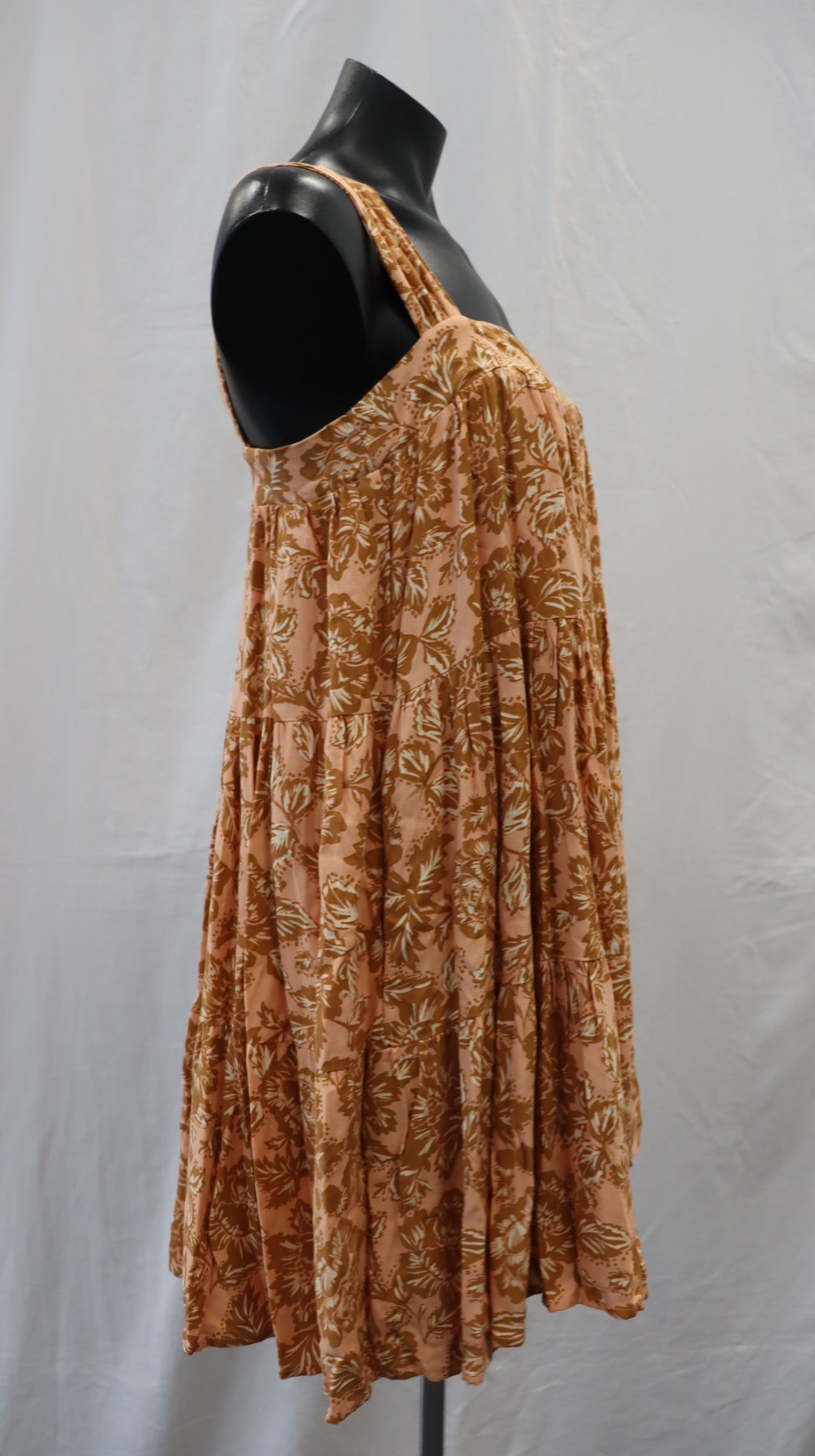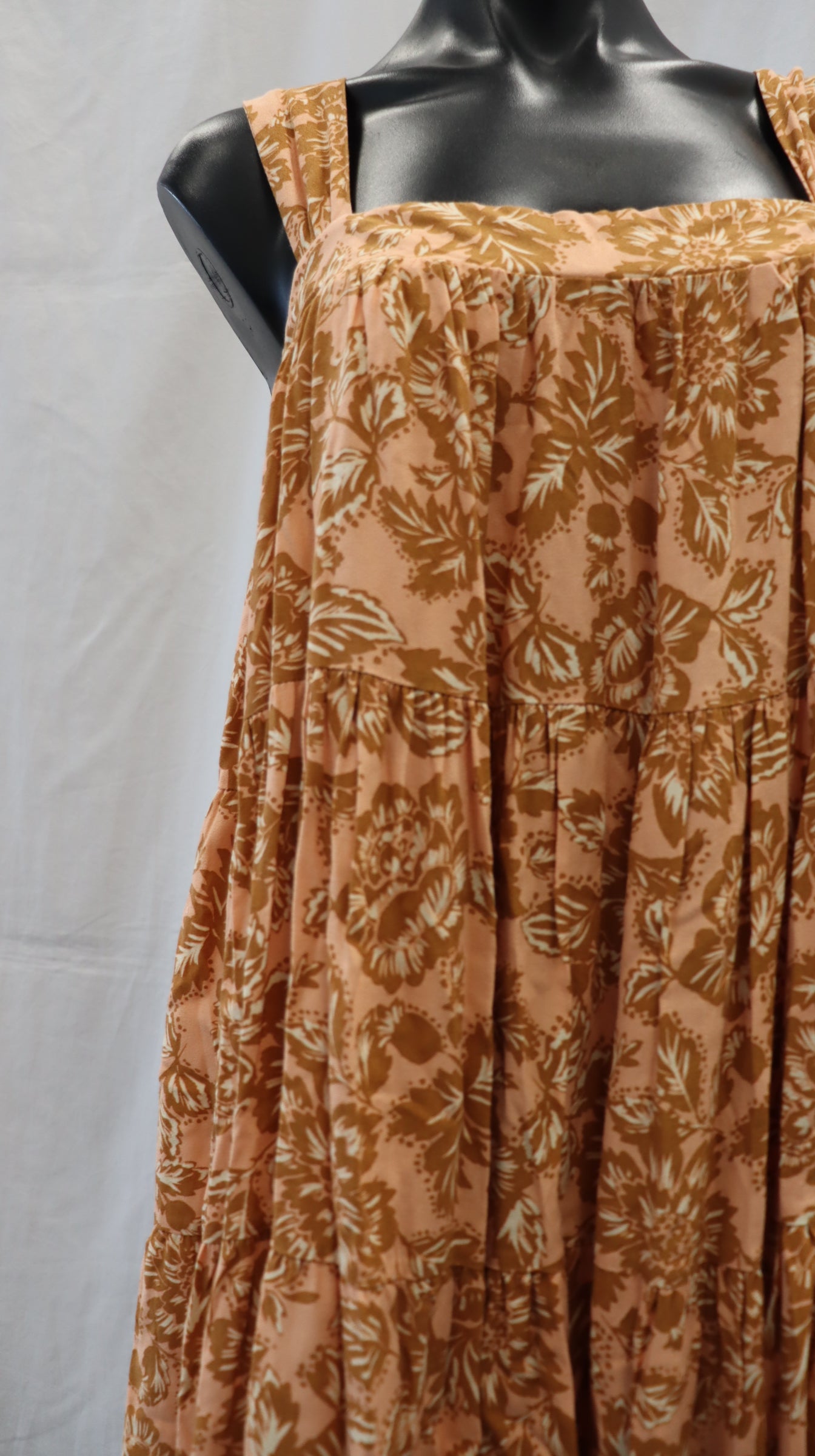 Peachy pink base colour with tan flowers, non adjustable shoulder straps, side seam pockets, tiered, BNWT