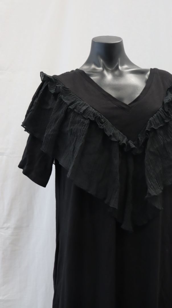 Tee dress, short sleeve, can be worn with a v neckline or a rounded neckline, has a crink sheer detail around the top, side seam pocket
