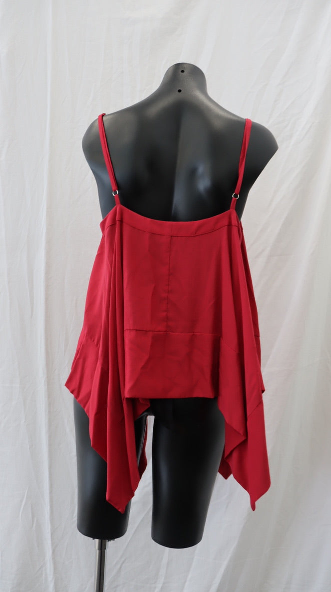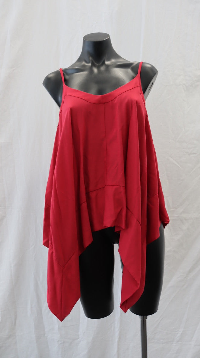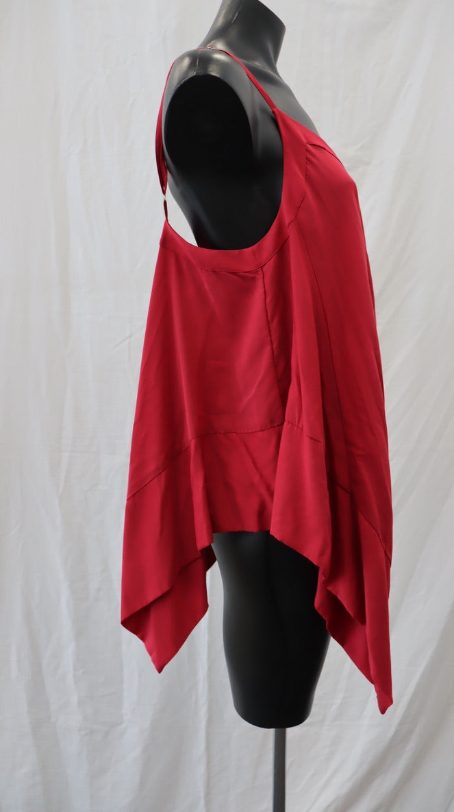 Pinky red colour, thin adjustable shoulder straps, pointed side detail, 65% rayon 35% cupro