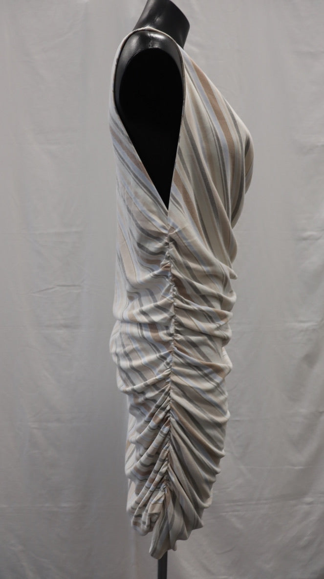 White with a brown blue and grey faint stripe, cowl neck, sleeveless, ruched sides