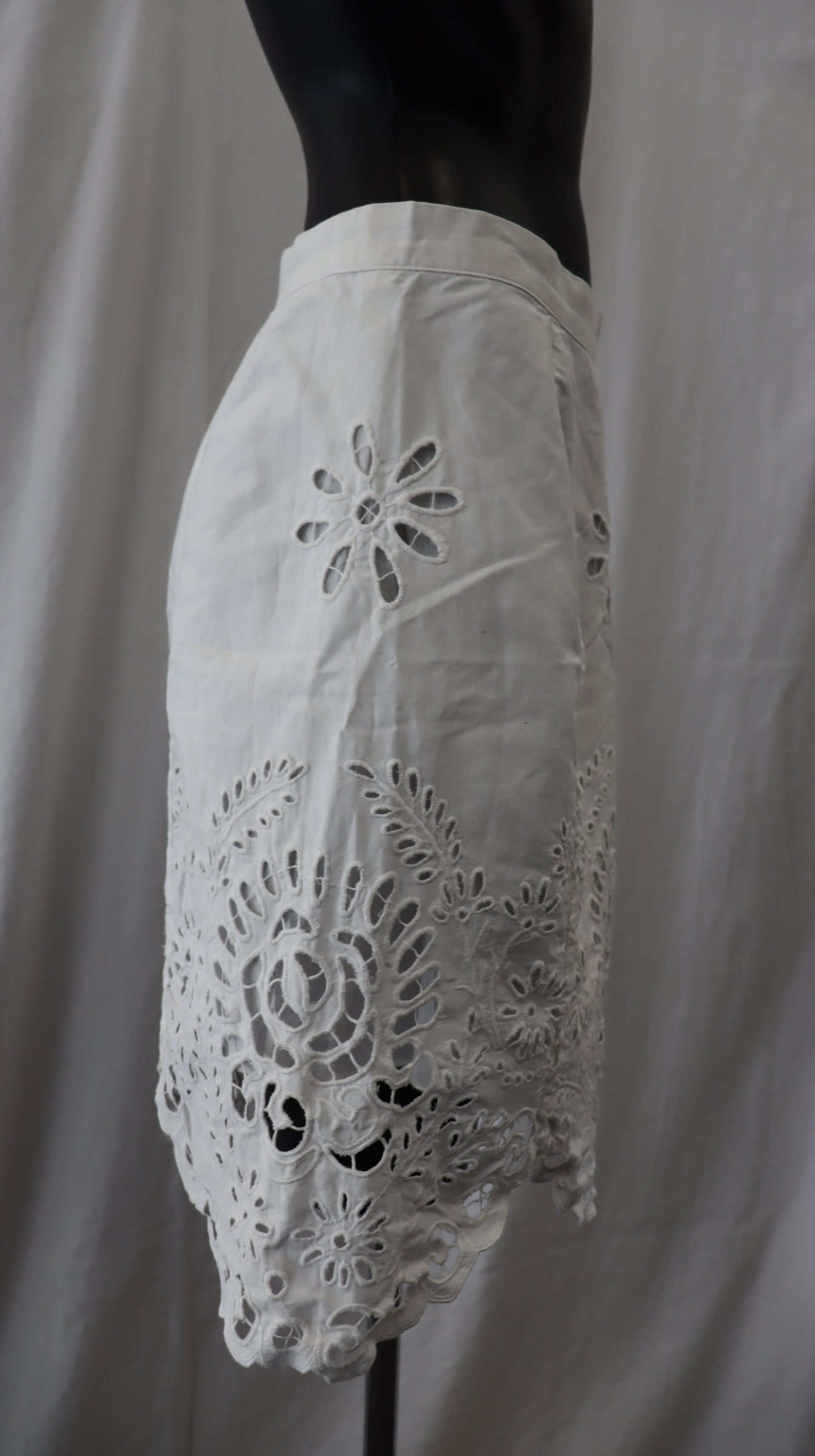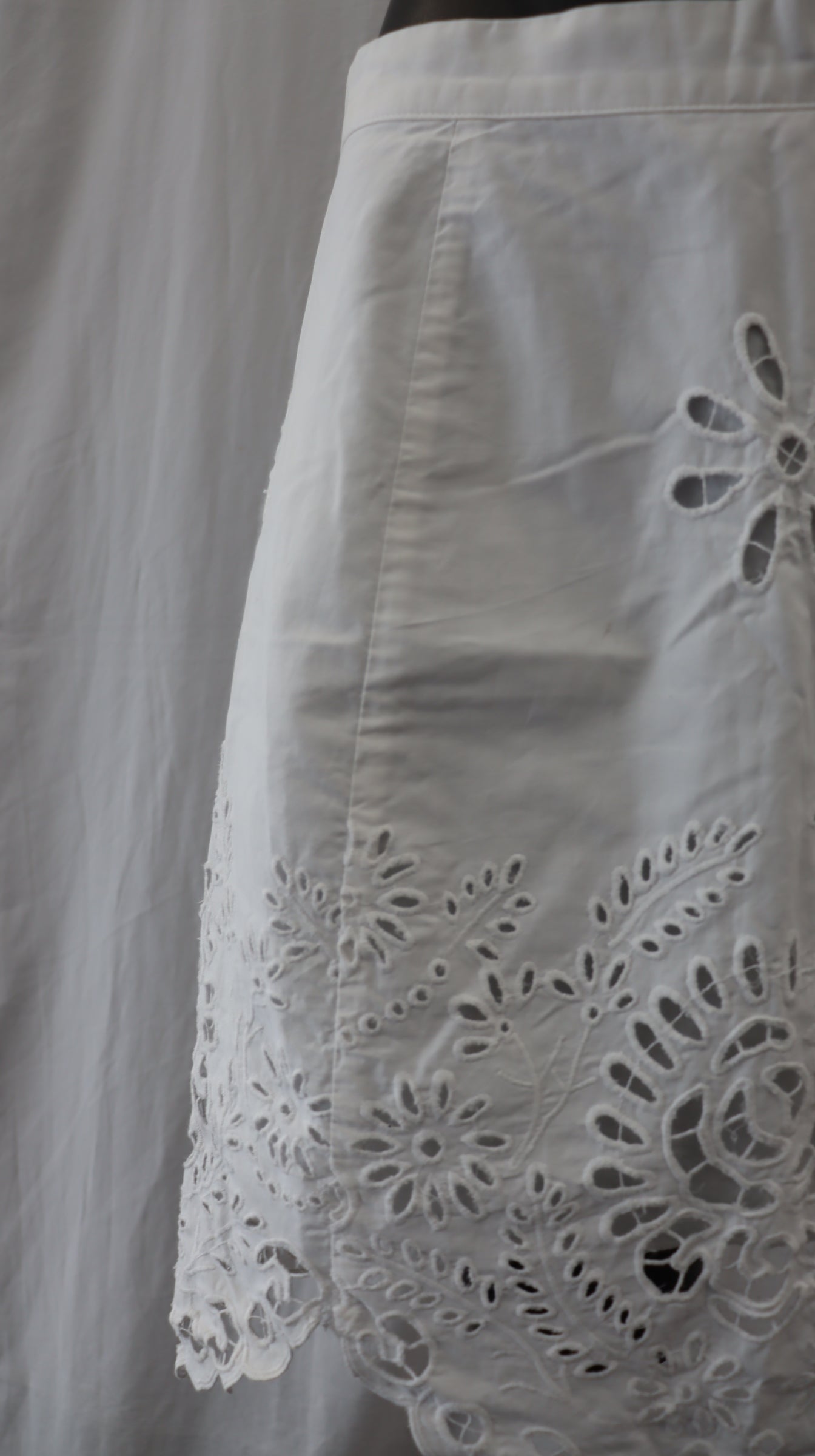 High waist, zipper and button on the back, lined 3/4, embroidered detail, cotton