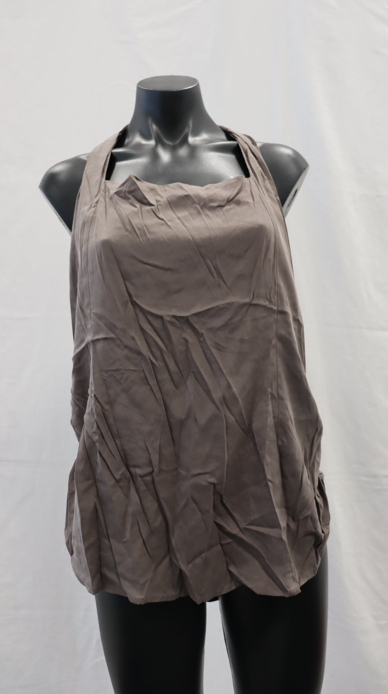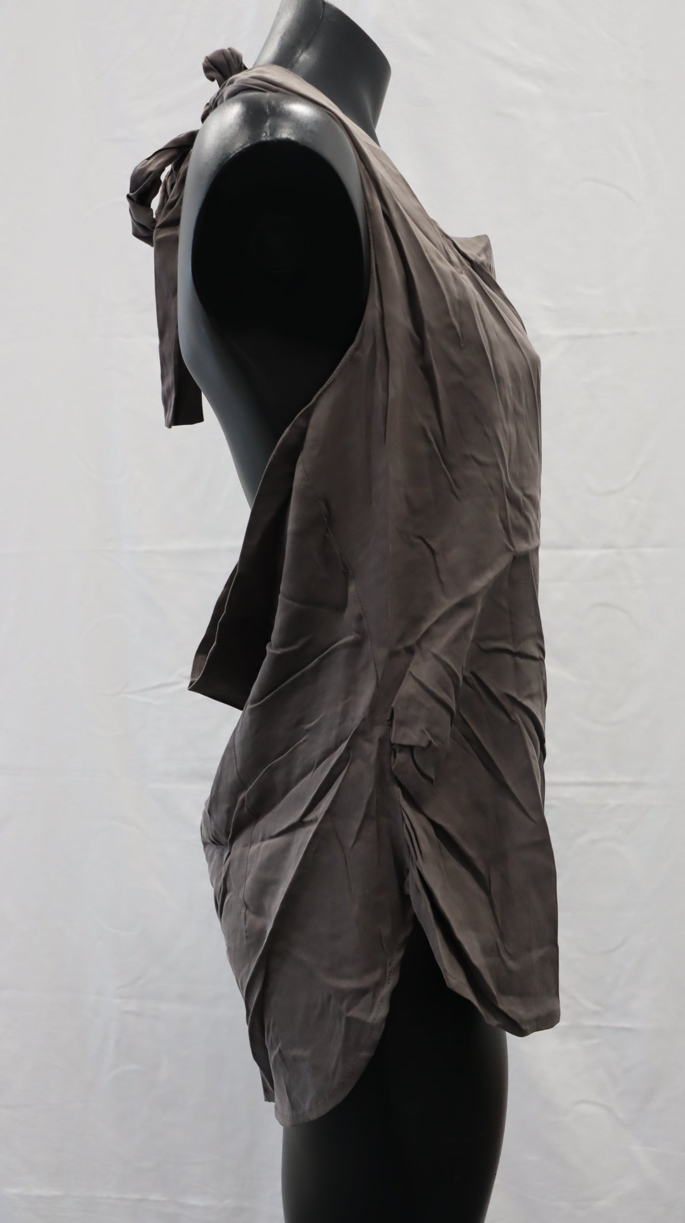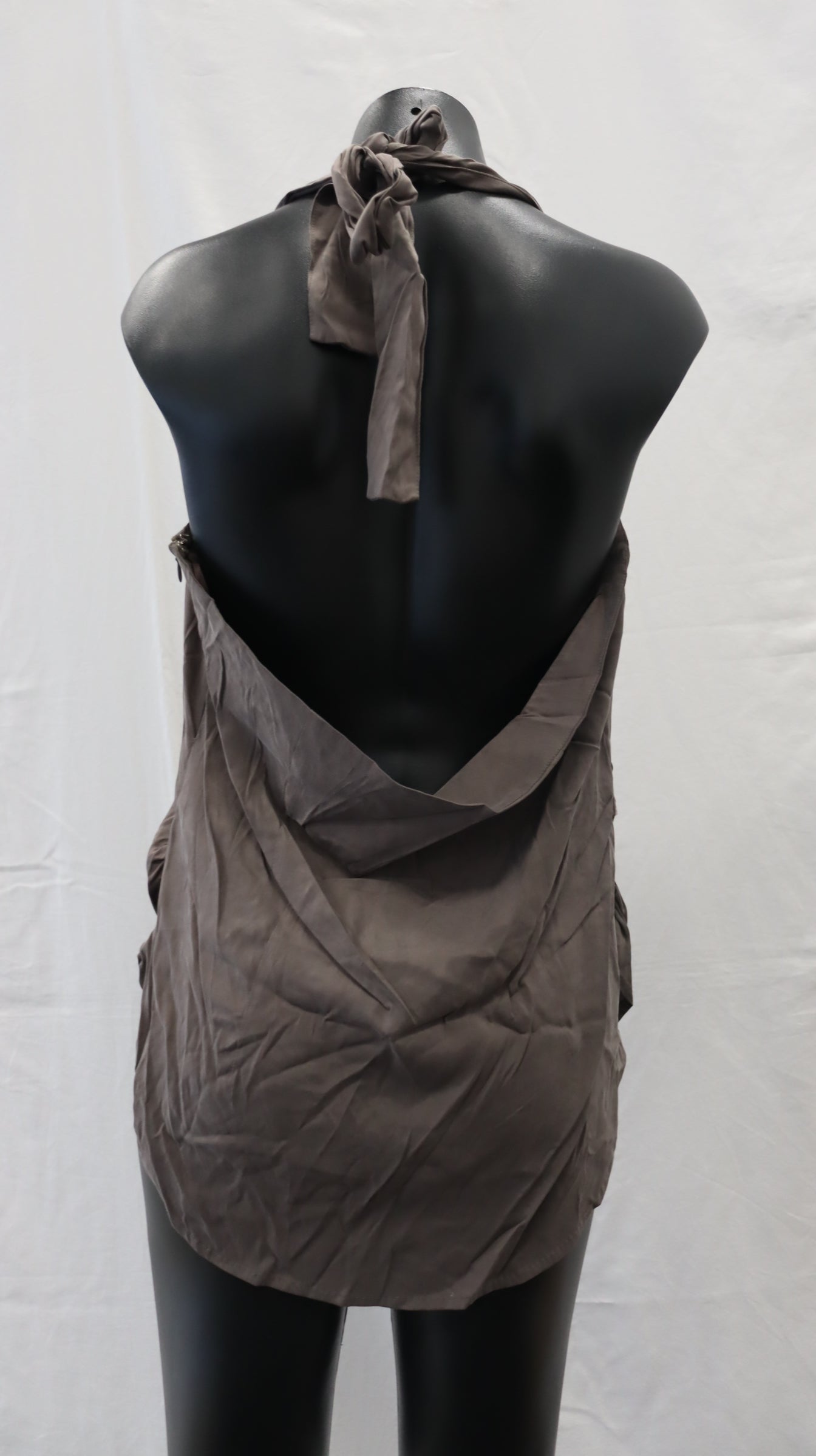 Ruby Reese halter top in pewter, Fitted halterneck top that ties at the back neck, cut in an earthy pewter shade. Small details such as front seam details and ruching at the side hems form the contoured shape of this piece. 66% cupro 30% viscose 4% spandex