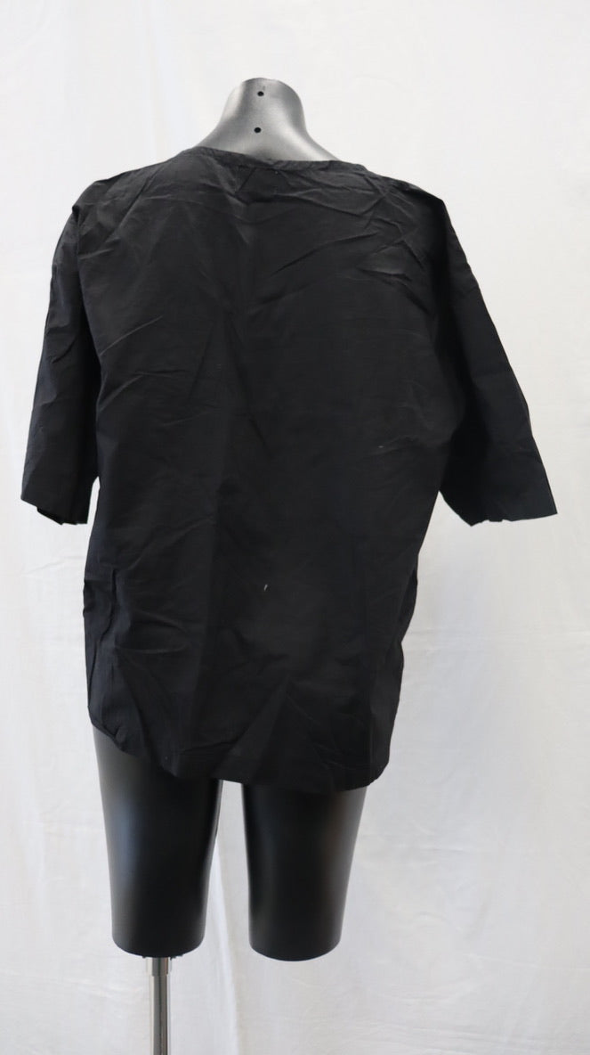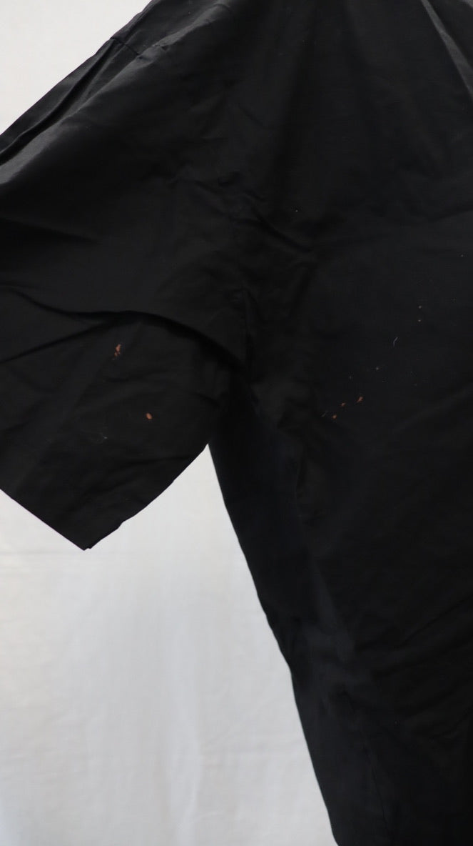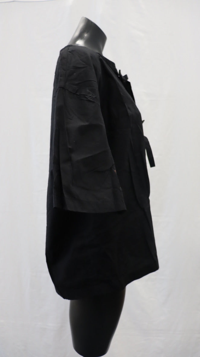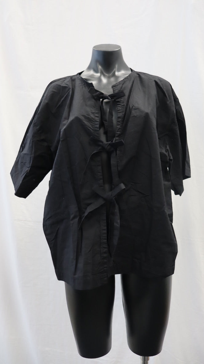 Three bow ties down the front all slightly unaligned, cotton, has a bleach splatter mark on the right sleeve/side