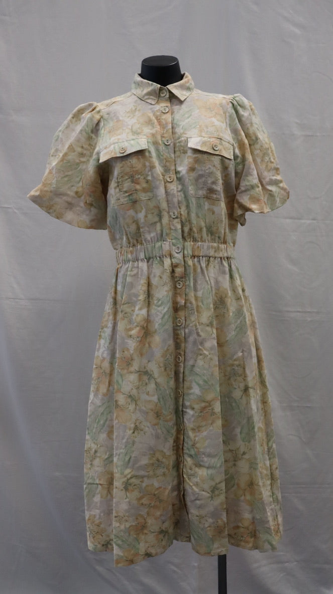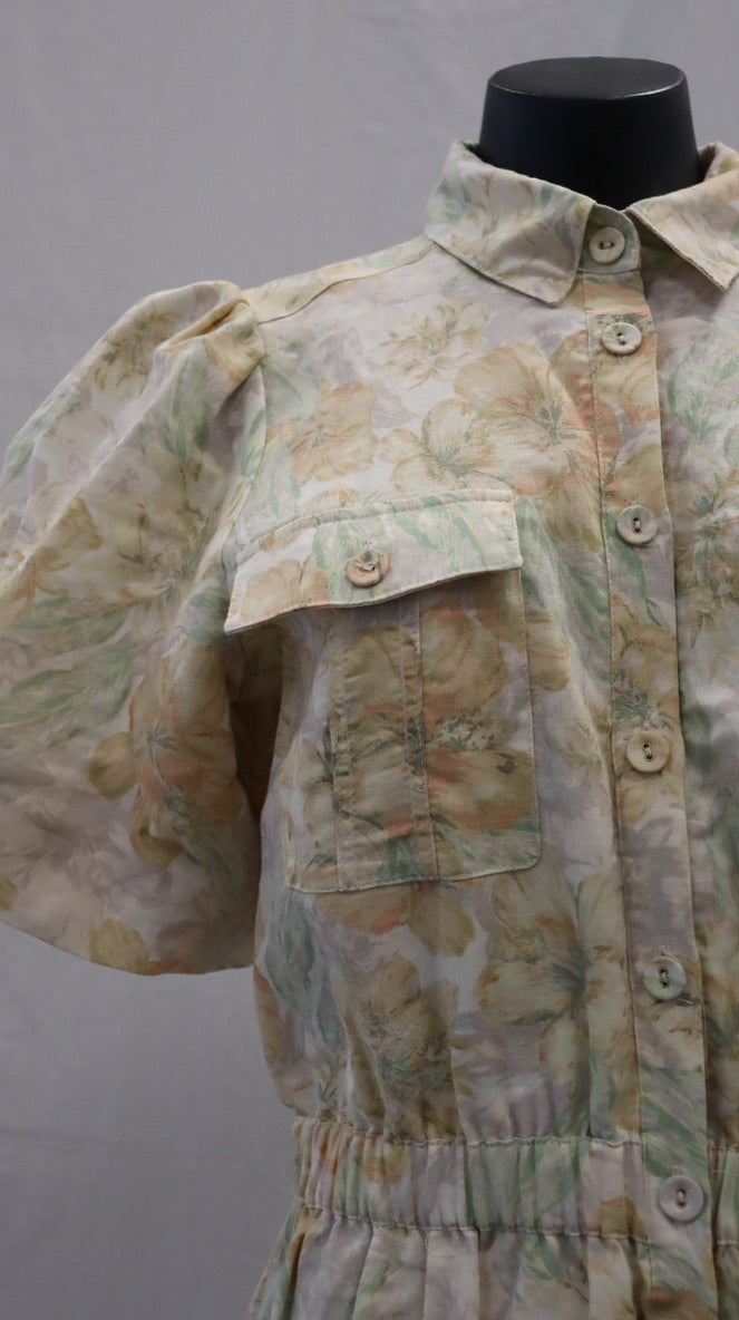 Puff short sleeve, buttons down the front, elastic waist, chest pockets, in a faint colour vintage floral pattern